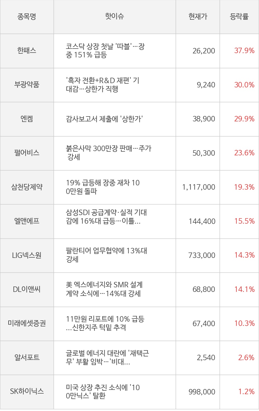 25일 오후의 주식시장에서는 한패스(37.9%), 부광약품(30.0%), 엔켐(29.9%), 펄어비스(23.6%) 등이 상승세를 보이며 투자자들의 주목을 끌고 있다 [라씨로 2026/03/25 15:10]