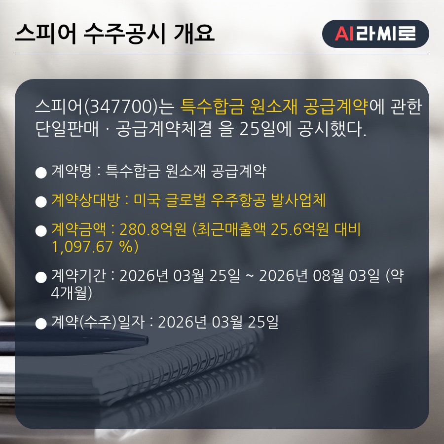 03월 25일 스피어(347700)는 수주공시를 발표했다.◆스피어 수주공시 개요- 특수합금 원소재 공급계약 280.8억원 (매출액대비 1,097.67 %)스피어 [라씨로 2026/03/25 14:55]