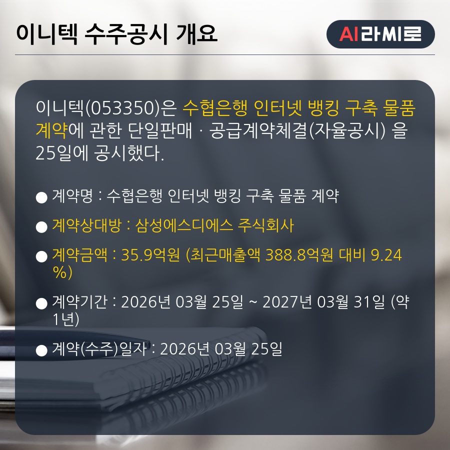 03월 25일 이니텍(053350)은 수주공시를 발표했다.◆이니텍 수주공시 개요- 수협은행 인터넷 뱅킹 구축 물품 계약 35.9억원 (매출액대비 9.24 [라씨로 2026/03/25 15:05]