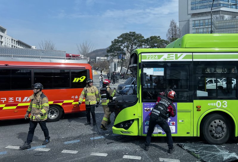 연세대 정문 앞서 버스 2대 충돌…운전자·승객 등 5명 경상14일 오전 서울시 서대문구 성산로 연세대학교 삼거리에서 발생한 교통사고 현장에 출동한 119구조대가 마을버스에서 운전자를 구조하고 [파이낸셜뉴스 2026/03/14 13:41]