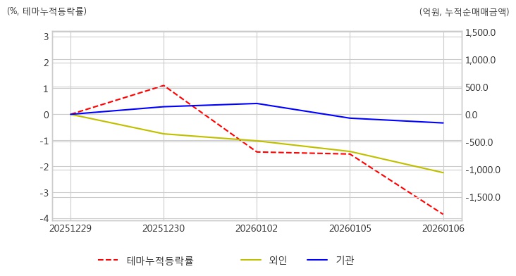 스마트카 테마는 최근에 다소 큰 폭으로 조정을 받았으나 오늘 다시 반등을 시도하며 전일 대비 3.41% 상승하고 있다. 이 기간 동안 개인 투자자들이 관련 종목을 꾸준히 사모아 1,262.36억원어치 순매수했으며, 외국인과 기관은 관련 종목을 각각 -1,060.95억원, -157.44억원 순매도 한 것으로 나타났다.