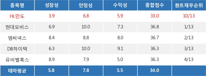 ◆HL만도의 퀀트 재무 점수 33.01점, 테마 내 10위