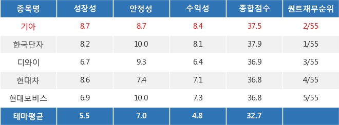 기아 성장성, 안정성, 수익성 모두 테마의 평균 점수를 상회하면서 퀀트 재무 순위 2위(총 58종목)를 차지했다.