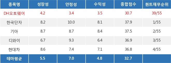 ◆DH오토웨어의 퀀트 재무 점수 30.66점, 테마 내 39위