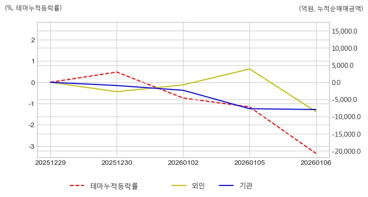 자율주행차 테마는 최근에 소폭의 조정이 있었지만 오늘 다시 반등을 시도하며 전일 대비 3.95% 상승하고 있다. 이 기간 동안 개인 투자자들이 관련 종목을 꾸준히 사모아 14,610.35억원어치 순매수했으며, 외국인과 기관은 관련 종목을 각각 -8,567.84억원, -7,945.75억원 순매도 한 것으로 나타났다.
