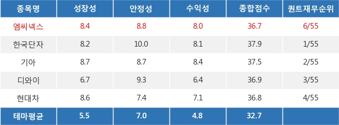 엠씨넥스 성장성, 안정성, 수익성 모두 테마의 평균 점수를 상회하면서 퀀트 재무 순위 6위(총 58종목)를 차지했다.