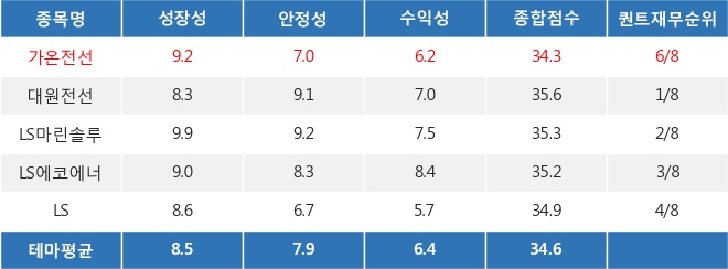 ◆가온전선의 퀀트 재무 점수 34.31점, 테마 내 6위