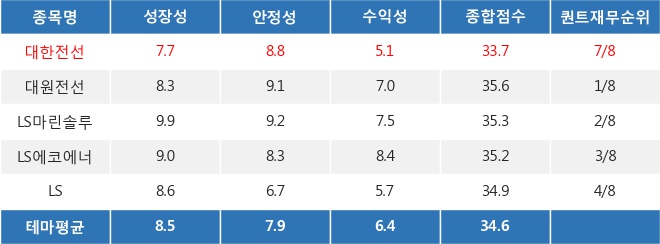 ◆대한전선의 퀀트 재무 점수 33.69점, 테마 내 7위