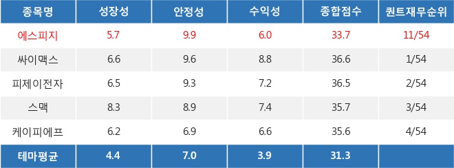 에스피지 성장성, 안정성, 수익성 모두 테마의 평균 점수를 상회하면서 퀀트 재무 순위 11위(총 56종목)를 차지했다.