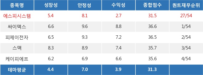 이는 테마내에서 다른 종목과 비교했을 때 에스피시스템스의 매출액이나 순이익 등의 증가 속도가 빠른 편이고, 대내외 경제환경 변화에 대한 대응 능력도 양호함을 알 수 있다.