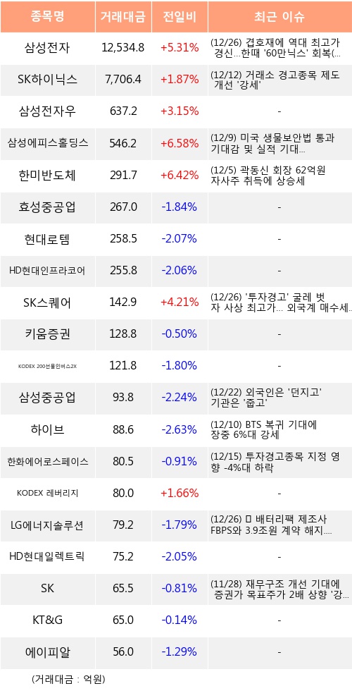 26일, 외국인 거래소에서 삼성전자(+5.31%), SK하이닉스(+1.87%) 등 순매수