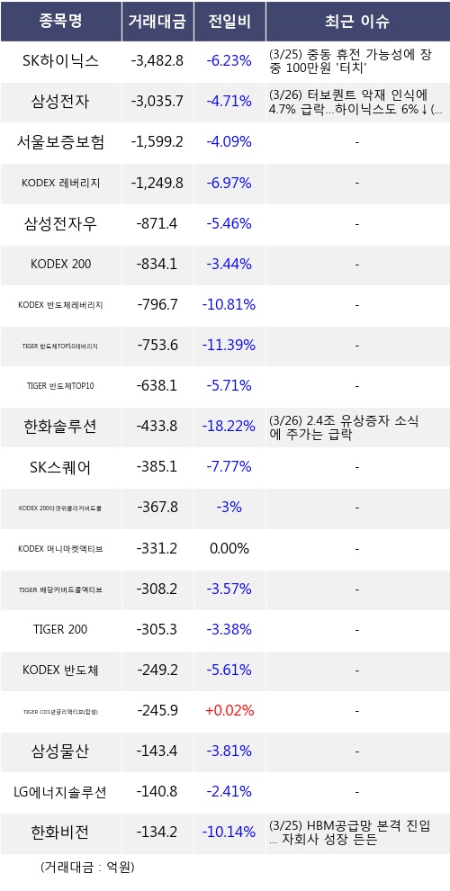 26일, 기관 거래소에서 SK하이닉스(-6.23%), 삼성전자(-4.71%) 등 순매도