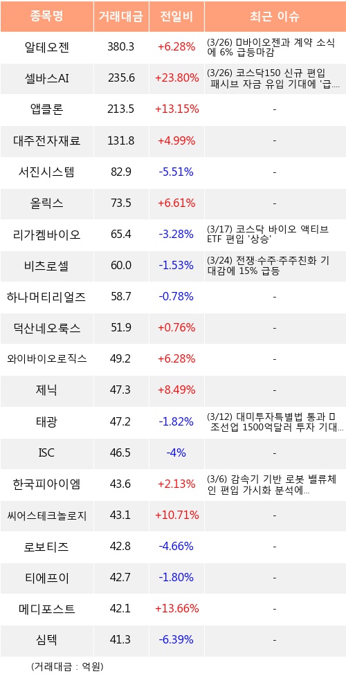 기관 투자자는 26일 코스닥에서 알테오젠, 셀바스AI, 앱클론 등을 중점적으로 사들인 것으로 나타났다.