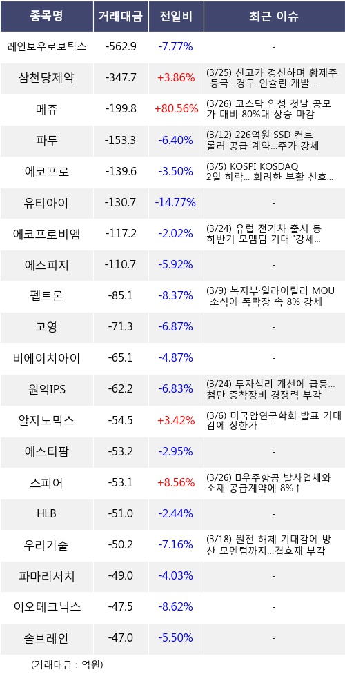 기관 투자자는 26일 코스닥에서 레인보우로보틱스, 삼천당제약, 메쥬 등을 중점적으로 매도한 것으로 나타났다.
