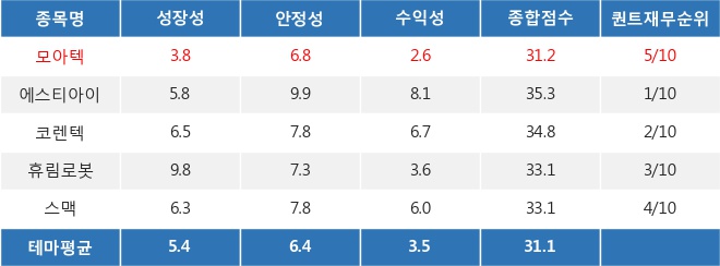 모아텍의 퀀트 재무 점수는 31.25점으로 테마 내에서 5위를 차지했다. 모아텍는 특히 재무 안정성 점수가 비교적 높은 편이었다.
