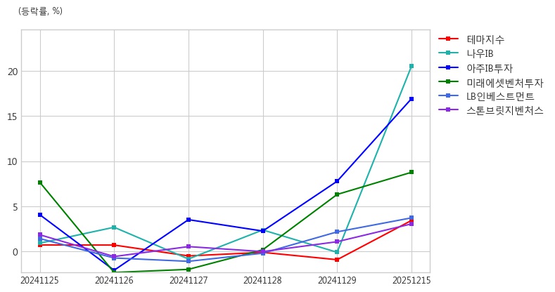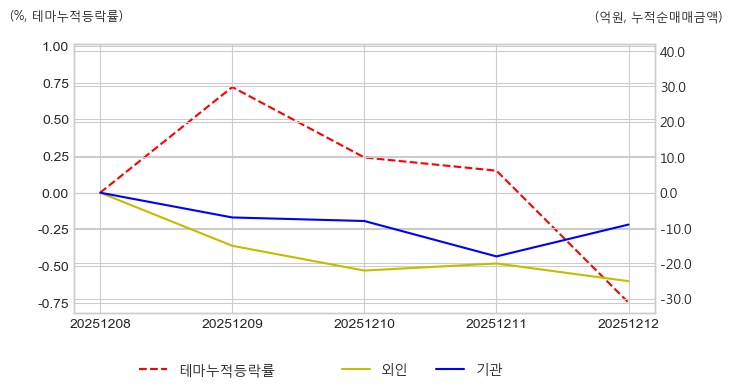창투사 테마는 최근에 소폭의 조정이 있었지만 오늘 다시 반등을 시도하며 전일 대비 3.44% 상승하고 있다. 이 기간 동안 외국인과 기관은 관련 종목을 -25.43억원, -9.65억원어치 순매도 했고, 개인은 34.04억원 순매수 한 것으로 나타났다.