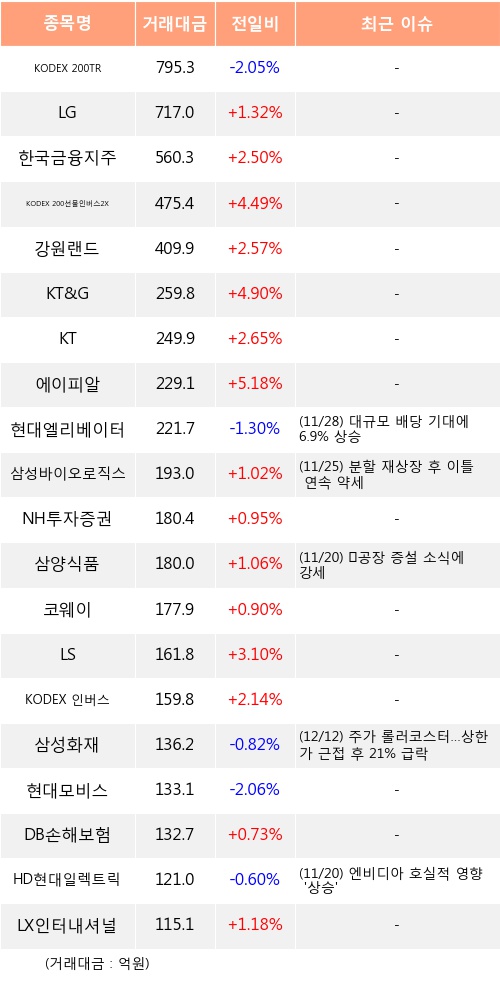 LG, 한국금융지주, KODEX 200선물인버스2X 등은 전일 대비 주가가 상승했고, KODEX 200TR, 현대엘리베이터, 삼성화재 등은 주가가 하락했다.