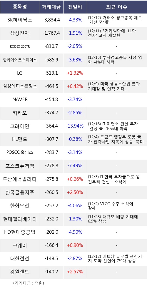 [12월16일]거래소 외국인 순매도 상위 종목