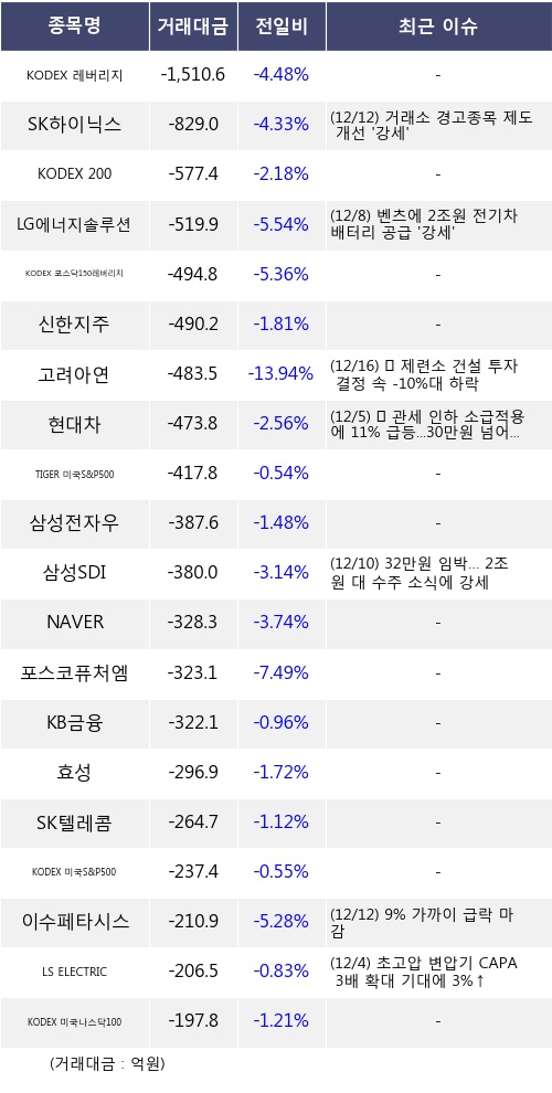 기관 투자자는 16일 거래소에서 KODEX 레버리지, SK하이닉스, KODEX 200 등을 중점적으로 매도한 것으로 나타났다.