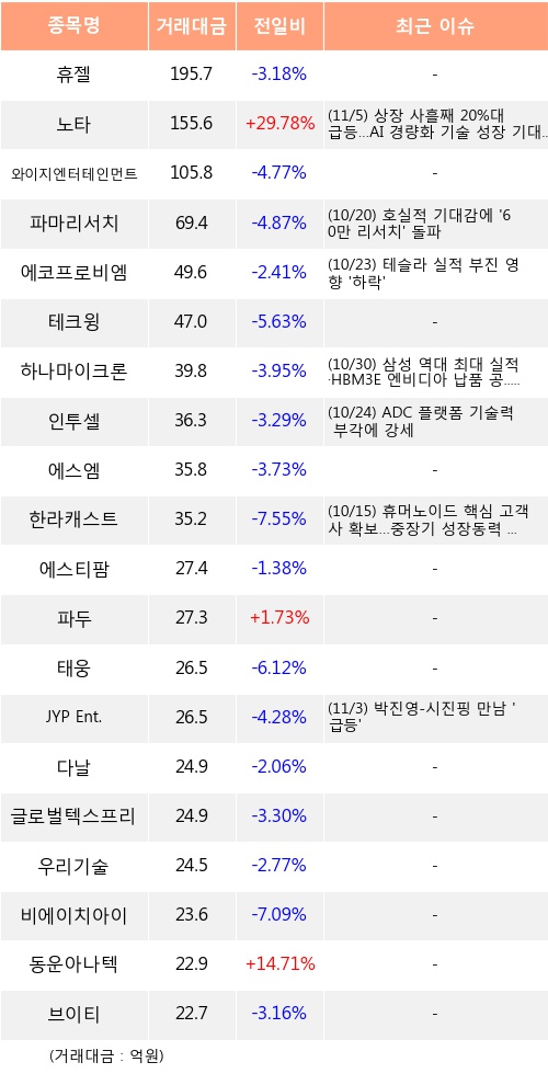 노타, 파두, 동운아나텍 등은 전일 대비 주가가 상승했고, 휴젤, 와이지엔터테인먼트, 파마리서치 등은 주가가 하락했다.