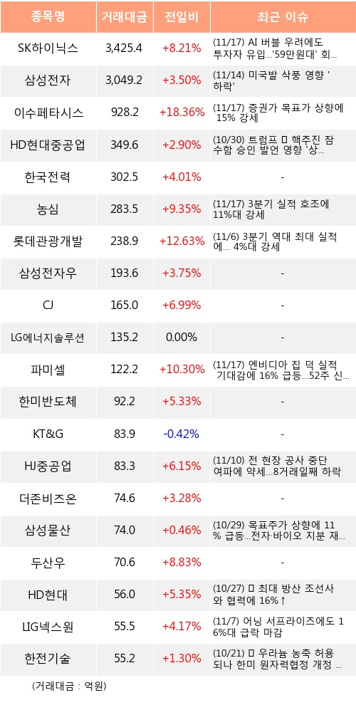 17일, 외국인 거래소에서 SK하이닉스(+8.21%), 삼성전자(+3.5%) 등 순매수