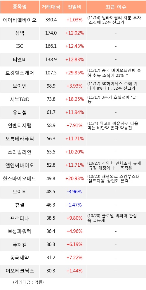 에이비엘바이오, 심텍, ISC 등은 전일 대비 주가가 상승했고, 브이티, 휴젤 등은 주가가 하락했다.