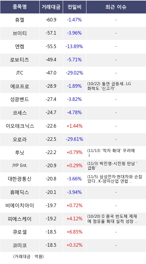 기관 투자자의 순매도 상위 20개 종목은 그린광학, 알트, 휴젤, 브이티, 엔켐, 로보티즈, JTC, 에코프로, 성광벤드, 코세스 등이다.