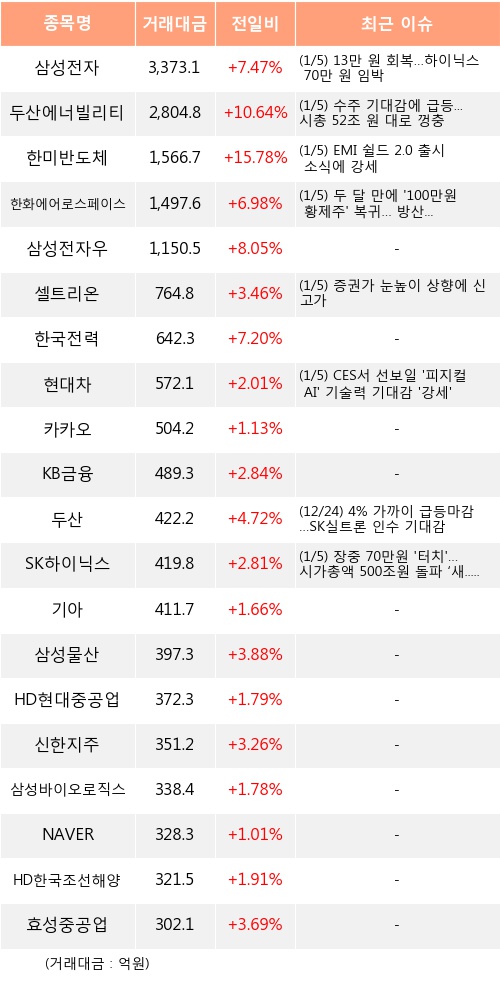 외국인 투자자는 05일 거래소에서 삼성전자, 두산에너빌리티, 한미반도체 등을 중점적으로 사들인 것으로 나타났다.
