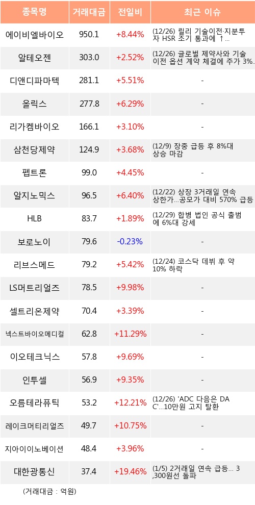 외국인 투자자의 순매수 상위 20개 종목은 에이비엘바이오, 알테오젠, 디앤디파마텍, 올릭스, 리가켐바이오, 삼천당제약, 펩트론, 알지노믹스, HLB, 보로노이 등이다.
