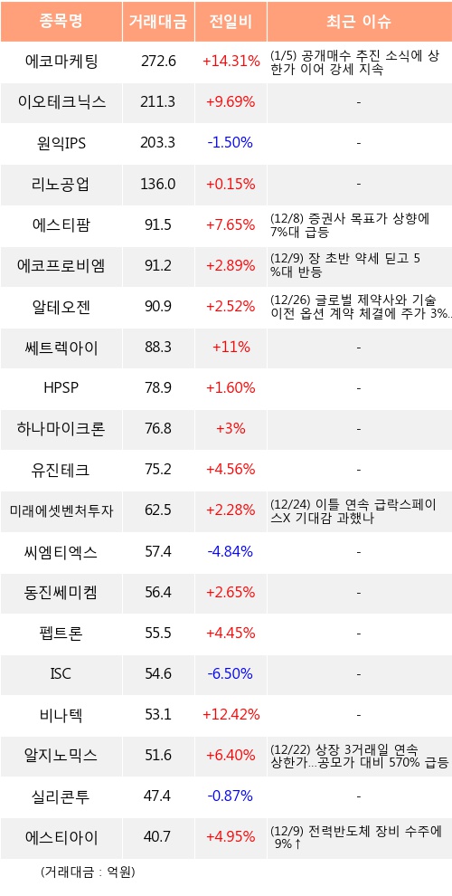 에코마케팅, 이오테크닉스, 리노공업 등은 전일 대비 주가가 상승했고, 원익IPS, 씨엠티엑스, ISC 등은 주가가 하락했다.