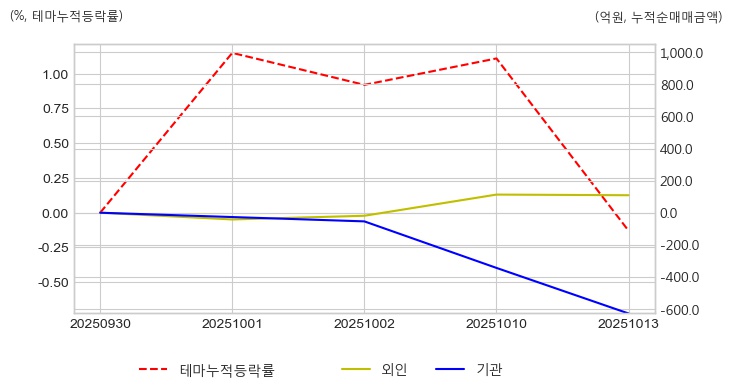양자암호/양자컴퓨팅 테마는 최근에 다소 큰 폭으로 조정을 받았으나 오늘 다시 반등을 시도하며 전일 대비 6.50% 상승하고 있다. 이 기간 동안 개인 투자자들이 493.93억원 순매수하며 테마 상승세를 주도했고, 외국인과 기관은 관련 종목을 각각 109.17억원 순매수, -628.24억원 순매도한 것으로 나타났다.