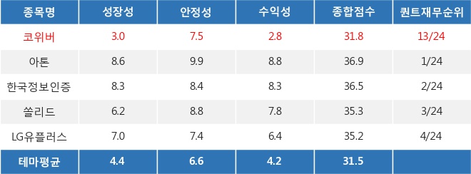 ◆코위버의 퀀트 재무 점수 31.81점, 테마 내 13위