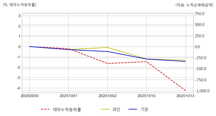 해운 테마는 최근에 다소 큰 폭으로 조정을 받았으나 오늘 다시 반등을 시도하며 전일 대비 6.27% 상승하고 있다. 이 기간 동안 외국인과 기관은 관련 종목을 -309.25억원, -337.95억원어치 순매도 했고, 개인은 633.73억원 순매수 한 것으로 나타났다.