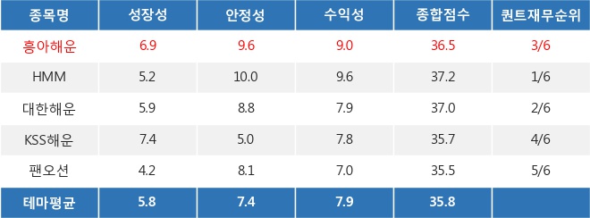 흥아해운 성장성, 안정성, 수익성 모두 테마의 평균 점수를 상회하면서 퀀트 재무 순위 3위(총 6종목)를 차지했다.