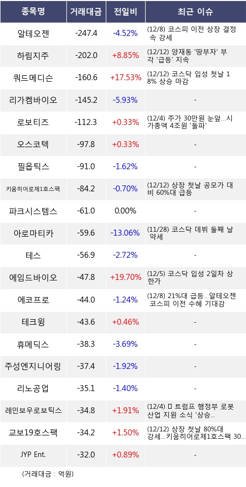 기관 투자자는 12일 코스닥에서 알테오젠, 하림지주, 쿼드메디슨 등을 중점적으로 매도한 것으로 나타났다.