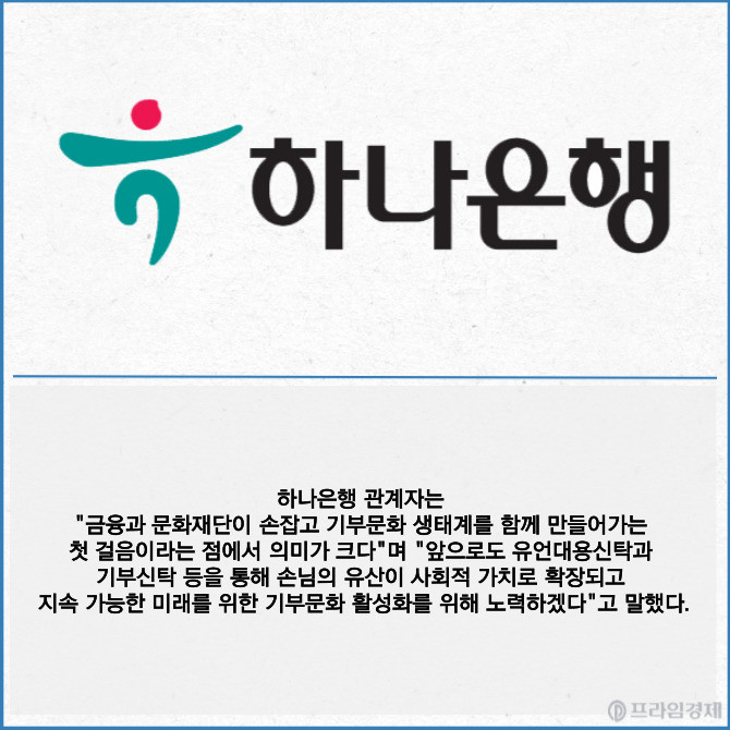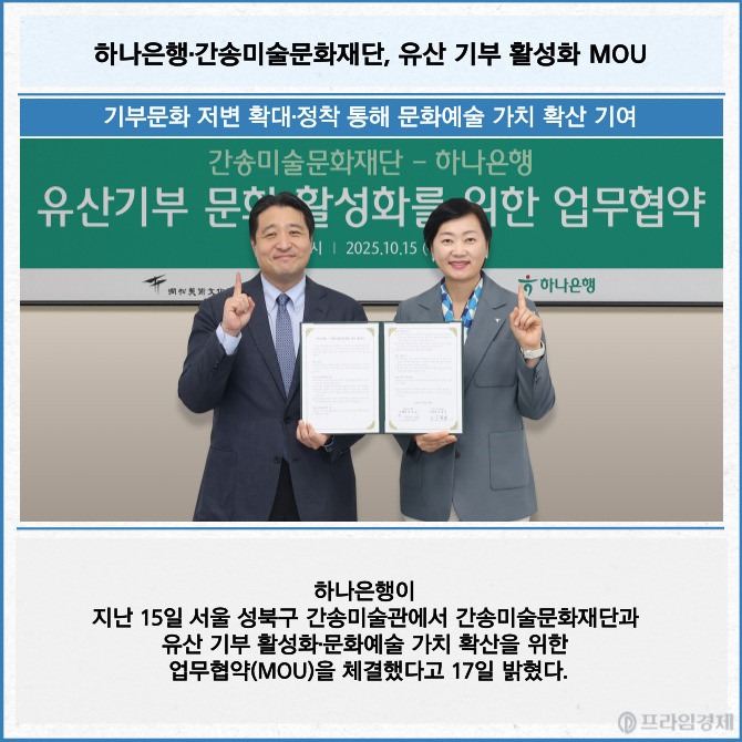 [프라임경제] 하나은행이 지난 15일 서울 성북구 간송미술관에서 간송미술문화재단과 유산 기부 활성화·문화예술 가치 확산을 위한 업무협약(MOU)을 체결했다고 17일 밝혔다.