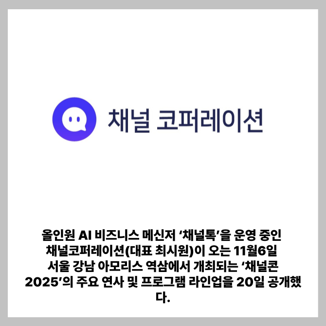 [프라임경제] 올인원 AI 비즈니스 메신저 '채널톡'을 운영 중인 채널코퍼레이션(대표 최시원)이 오는 11월6일 서울 강남 아모리스 역삼에서 개최되는 '채널콘 2025'의 주요 연사 및 프로그램 라인업을 20일 공개했다.