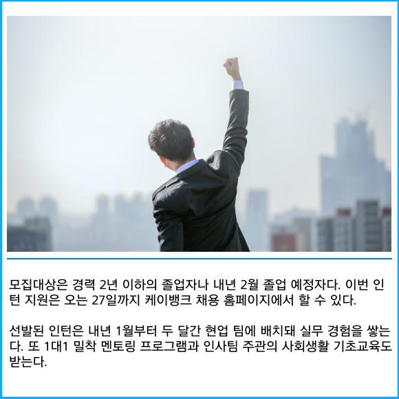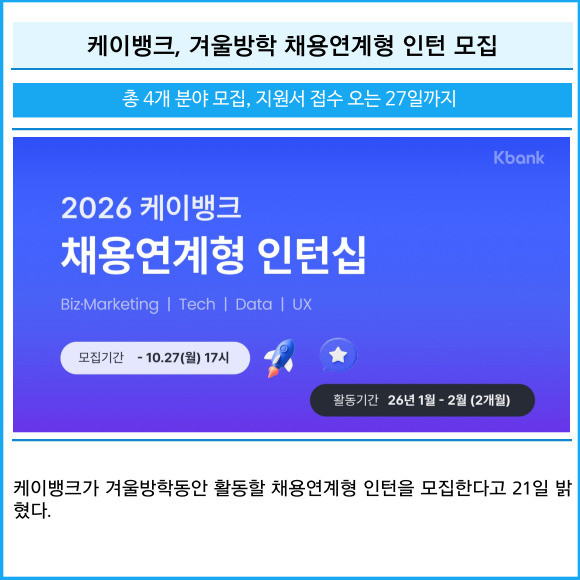[프라임경제] 케이뱅크가 겨울방학동안 활동할 채용연계형 인턴을 모집한다고 21일 밝혔다.