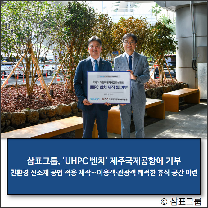 삼표그룹이 친환경 신소재 공법인 초고성능 콘크리트(UHPC; Ultra High Performance Concrete)를 적용해 제작한 벤치를 제주국제공항에 기부, 이용객과 관광객들에게 쾌적한 휴식 공간을 선사할 예정이다.