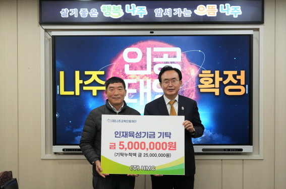 나주시(시장 윤병태)는 ㈜HMC 이리중 대표가 지난 24일 지역 인재 양성을 위해 인재육성기금 500만원을 (재)나주교육진흥재단에 기탁했다고 26일 밝혔다.