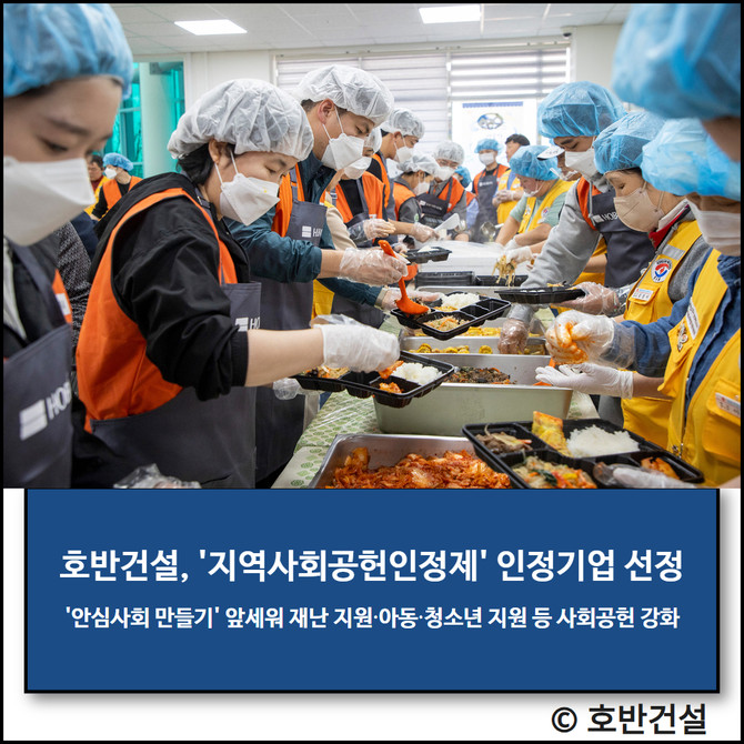 호반건설은 올해 처음 지역사회공헌인정제 인증을 받았다. 호반산업, 대한전선 등 그룹 계열사와 함께 임직원 봉사활동, 재난 피해 아동·청소년 지원 등 다양한 프로그램을 전개해 왔다. 올해는 '안심사회 만들기’를 사회공헌 핵심 가치로 삼아 기업의 사회적 책임을 실천하고 있다.