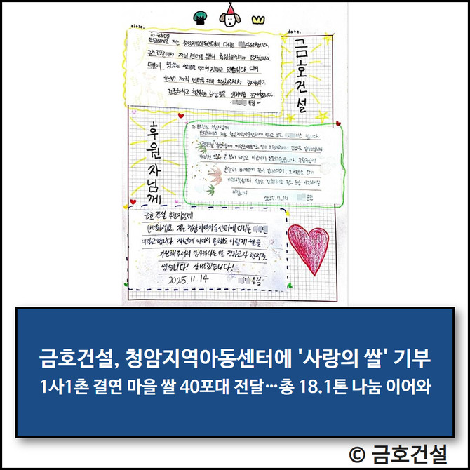 금호건설 관계자는 "아이들이 보내온 손편지는 오히려 우리에게 더 큰 힘이 된 소중한 선물이었다"라며 "앞으로도 아이들과 지역사회에 작은 빛이 될 수 있도록 따뜻함을 나누는 활동을 꾸준히 이어가겠다"라고 전했다.
