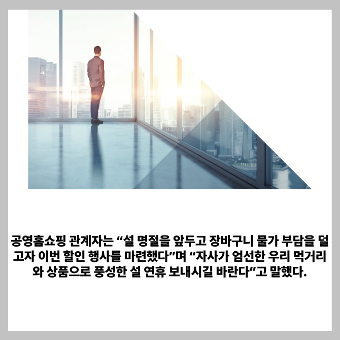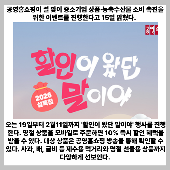 [프라임경제] 공영홈쇼핑이 설 맞이 중소기업 상품·농축수산물 소비 촉진을 위한 이벤트를 진행한다고 15일 밝혔다.
