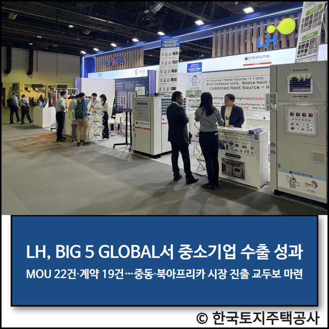 한국토지주택공사(LH)는 'UAE 두바이 건축 기자재 전시회(BIG 5 GLOBAL)'에서 LH K-TECH 전시관을 운영해 MOU 22건, 계약 19건 등 약 91억원 규모 중소기업 해외 실적 달성을 지원했다고 22일 밝혔다.