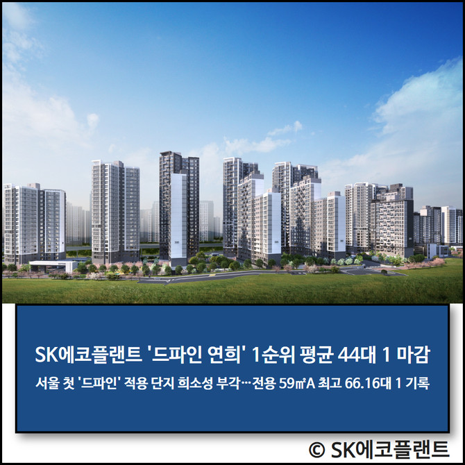 SK에코플랜트는 자사가 시공하는 '드파인 연희'가 1순위 해당 지역 청약에서 평균 44.07대 1의 경쟁률을 기록하며 마감됐다고 22일 밝혔다. 프리미엄 브랜드 '드파인'이 서울에 처음 적용된다는 희소가치에 연희동 고유의 주거 헤리티지와 서울 신축 단지 선호 흐름이 맞물리며 수요가 집중된 것이라는 분석이다.